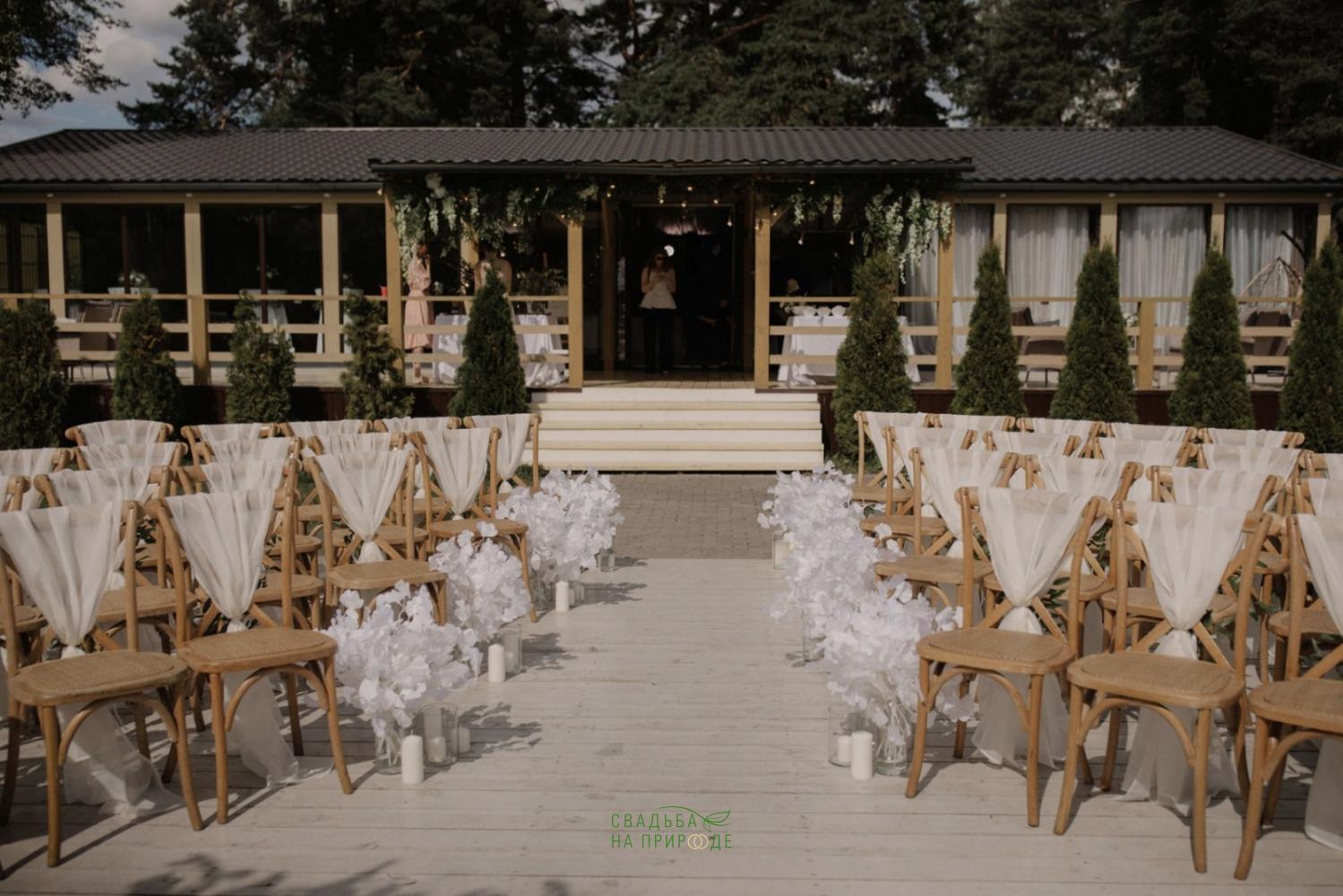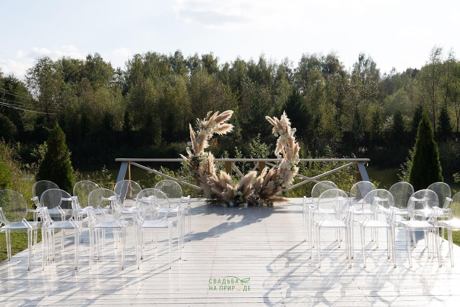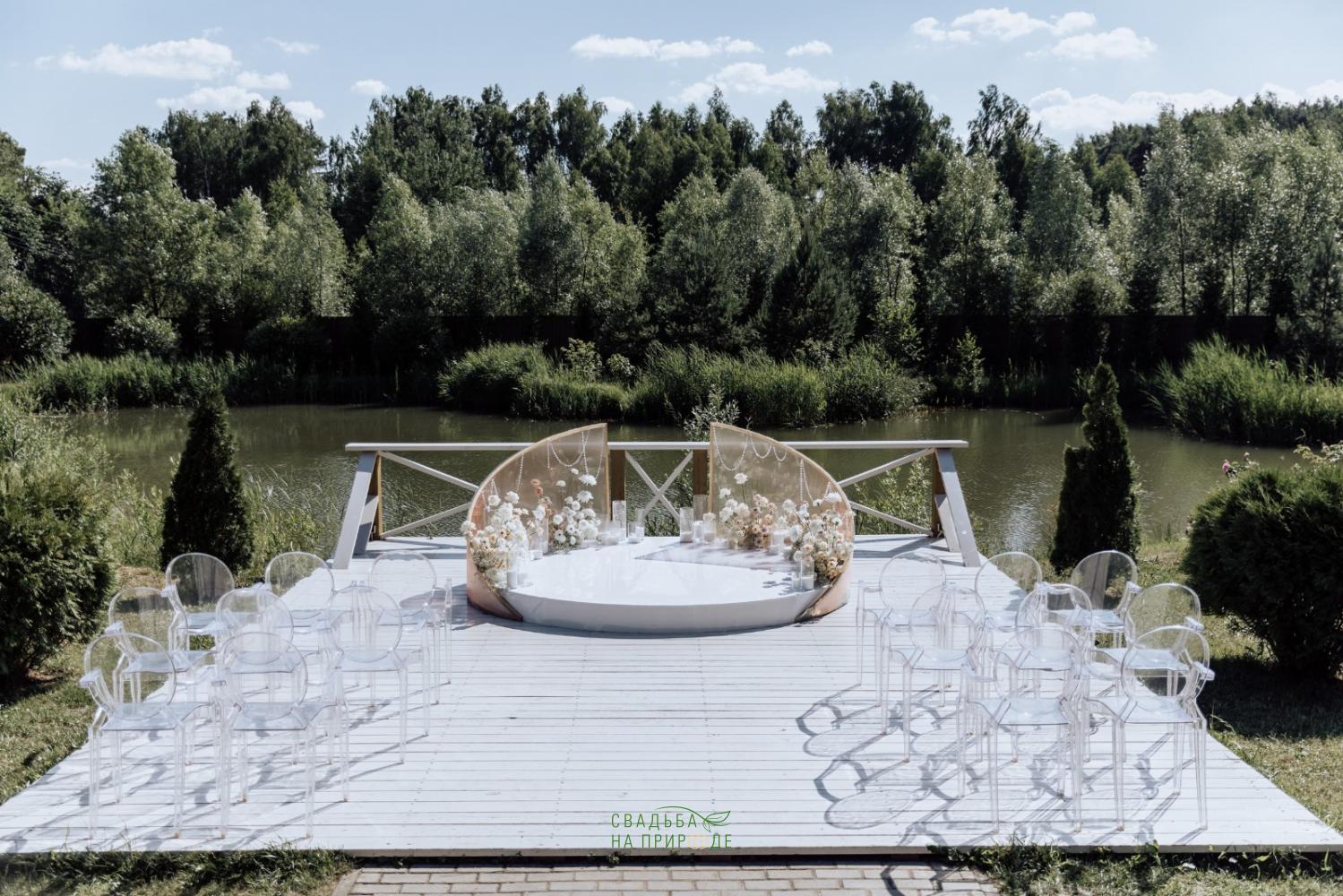 Здесь просторная, закрытая территория, красивая природа, сосны. Есть пруд, около которого можно устроить выездную церемонию.