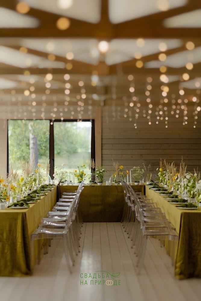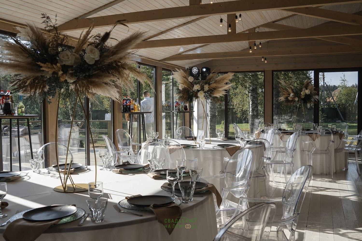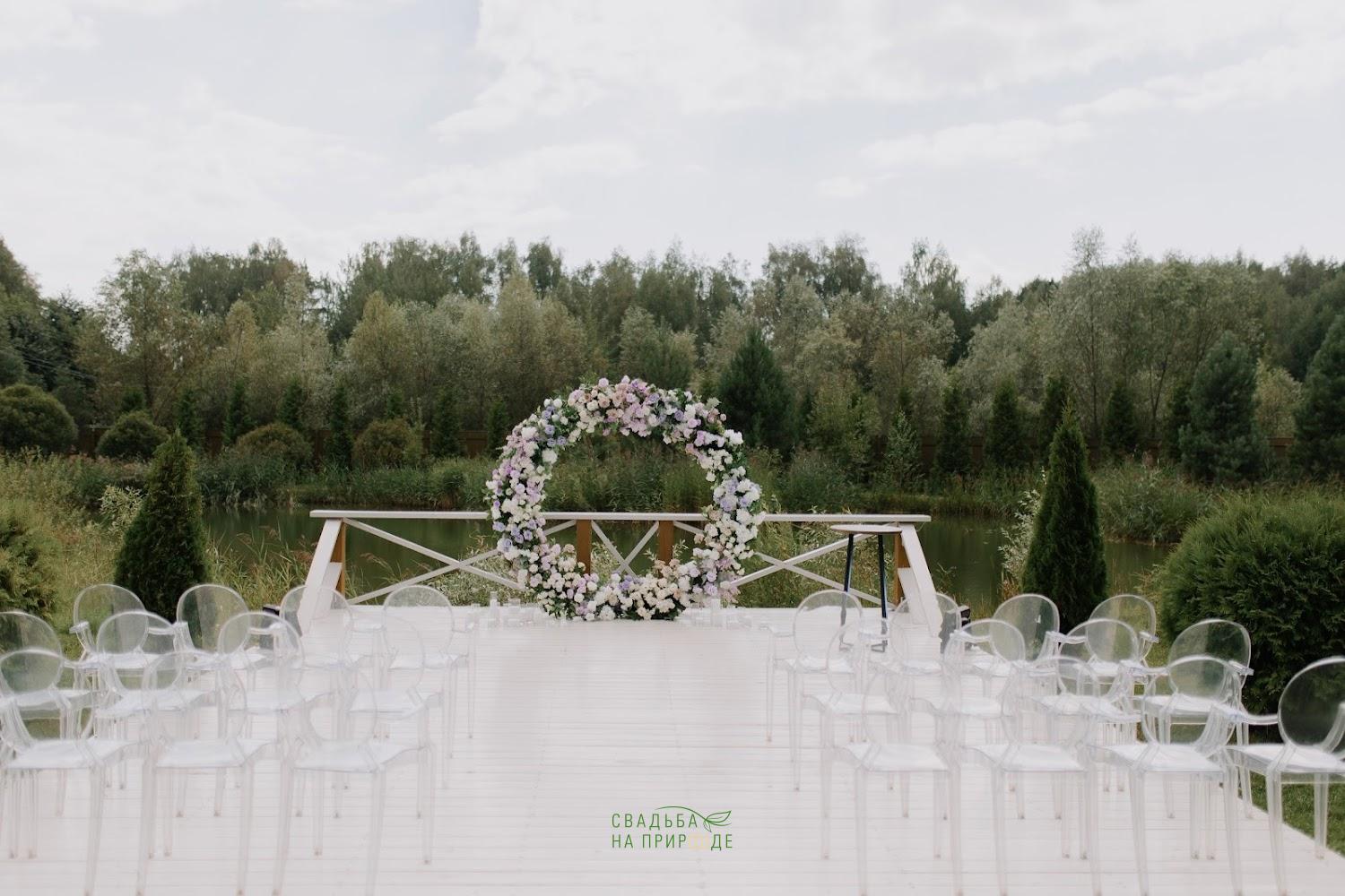 Здесь просторная, закрытая территория, красивая природа, сосны. Есть пруд, около которого можно устроить выездную церемонию.