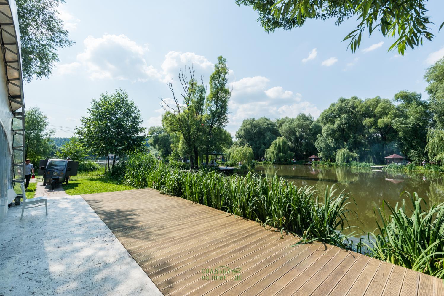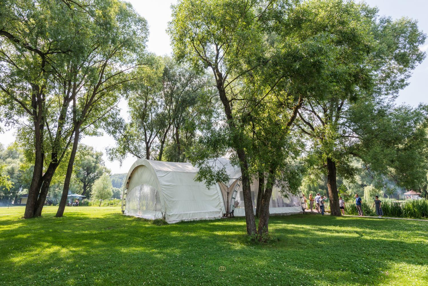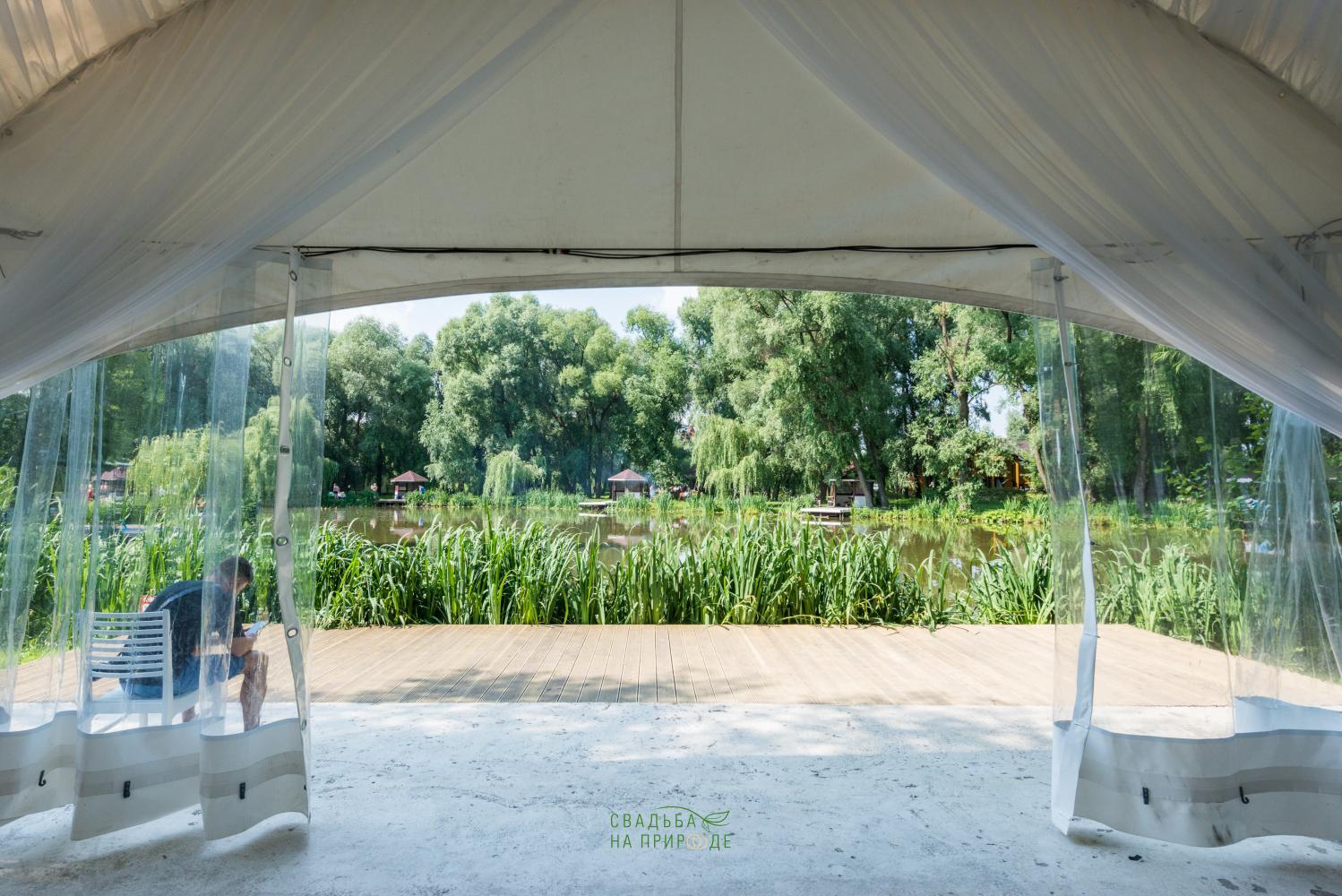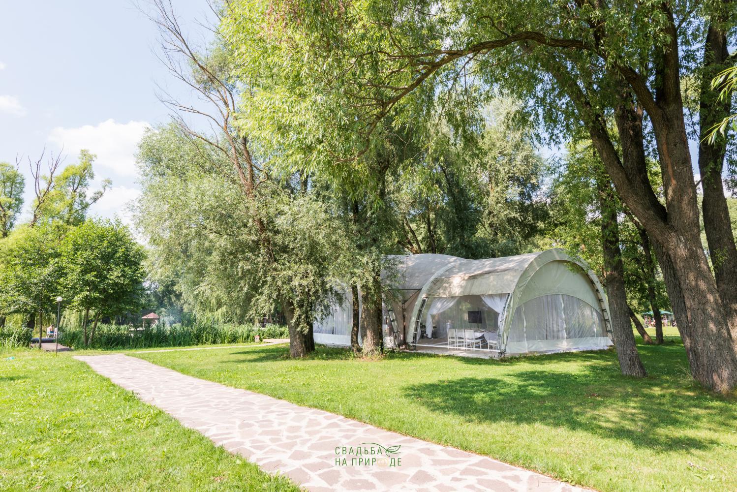 В парк-отеле Остров мы проводили нашу свадьбу в шатре Маэстро. Сама локация - представляет собой живописнейшее место с просторными лужайками, старыми прудами и раскидистыми деревьями. Наш шатер был достаточно удаленно расположен от других мест, где в этот день проводились свадьбы (а их было в тот день целых 5), шум от других празднований практически не был слышен.