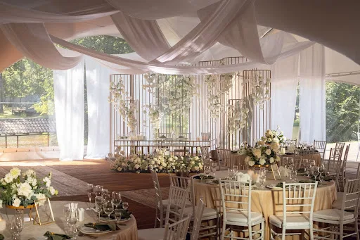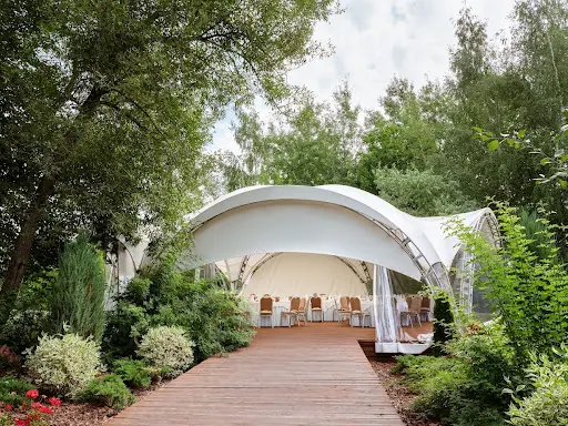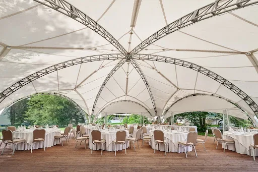 - Шатры — стильное решение для летних праздников на природе с защитой от солнца и дождя, подходит для тематического оформления