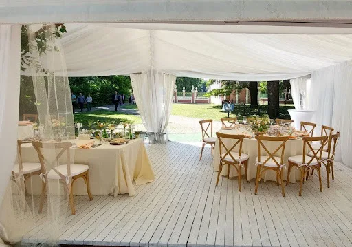 - Банкет. Обратите внимание, работает ли усадьба со своим рестораном или нужно привлекать кейтеринговую службу. Сторонний кейтеринг — это свобода выбора, но и дополнительные расходы на логистику и аренду кухни.